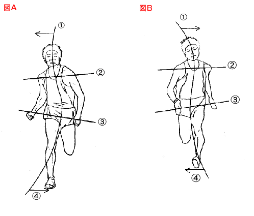 ②は両肩関節のすぐ下を結んだ線、③は両股関節を結んだ線です。この②と③からわかるの は、図Aの②は右(末續にとっての右。以下同)が少しかしいで左が高く、③は右が高く左が低くなっていて、図Bではそれがおおよそ逆になっている、つまり、彼が②と③、すなわち肩と腰 で挟み込んだ部分を一歩ごと左右交互に閉じたり開いたりして走っているということです。私はこの動きを「肩腰交互開閉」と呼んでいますが、これも彼の身体が左右の波動運動を起こしていることを示すものです。